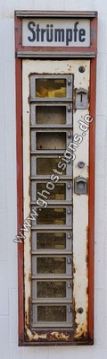 Die Zielgruppe des Automaten war in der Damenwelt zu suchen. Strümpfe meint hierbei nicht die heutigen Socken sondern Strumpfhosen bzw. beinlange Strümpfe. Laufmaschen waren ein absolutes no go, wenn man am Wochenende Tanzen ging und der Automat hat sicher aus mancher Notlage gerettet. Strumpfhosen waren damals kein günstiges Vergnügen und am Automaten waren 3 DM fällig, einschl. Inflation wären das heute etwa 8,20 €. In den 50er Jahren befand sich in dem angrenzenden Haus der Lebensmittelladen von Josef Zimmermann, der Geschäftsraum ist aber längst einer Wohnung gewichen.